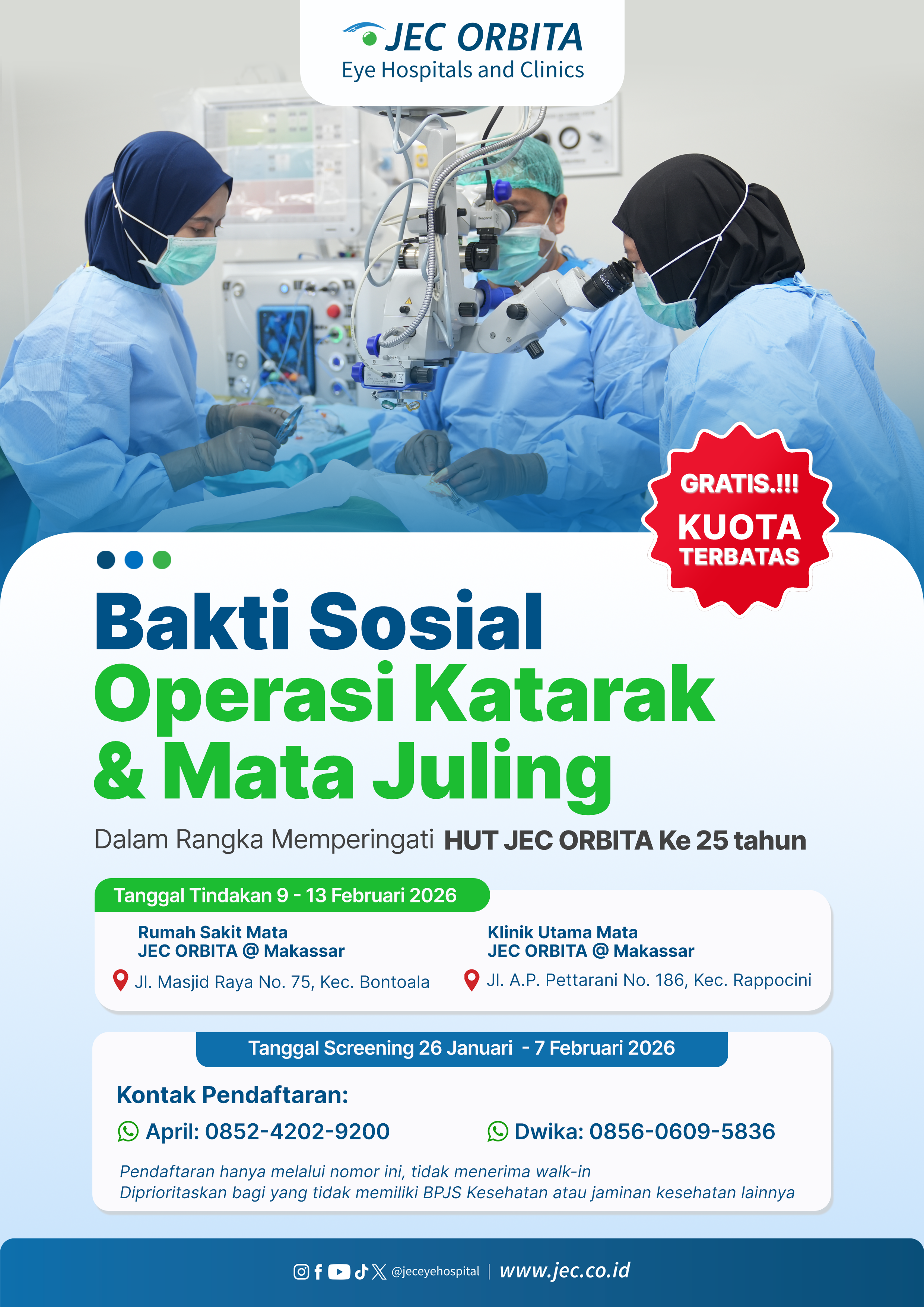 Pemeriksaan Mata Menyeluruh dan LengkapKeluhan Mata UmumKonsultasi Kacamata, Lensa Kontak, LASIK, Bedah RefraktifPerawatan Mata KeringPemeriksaan Anak & Lansia